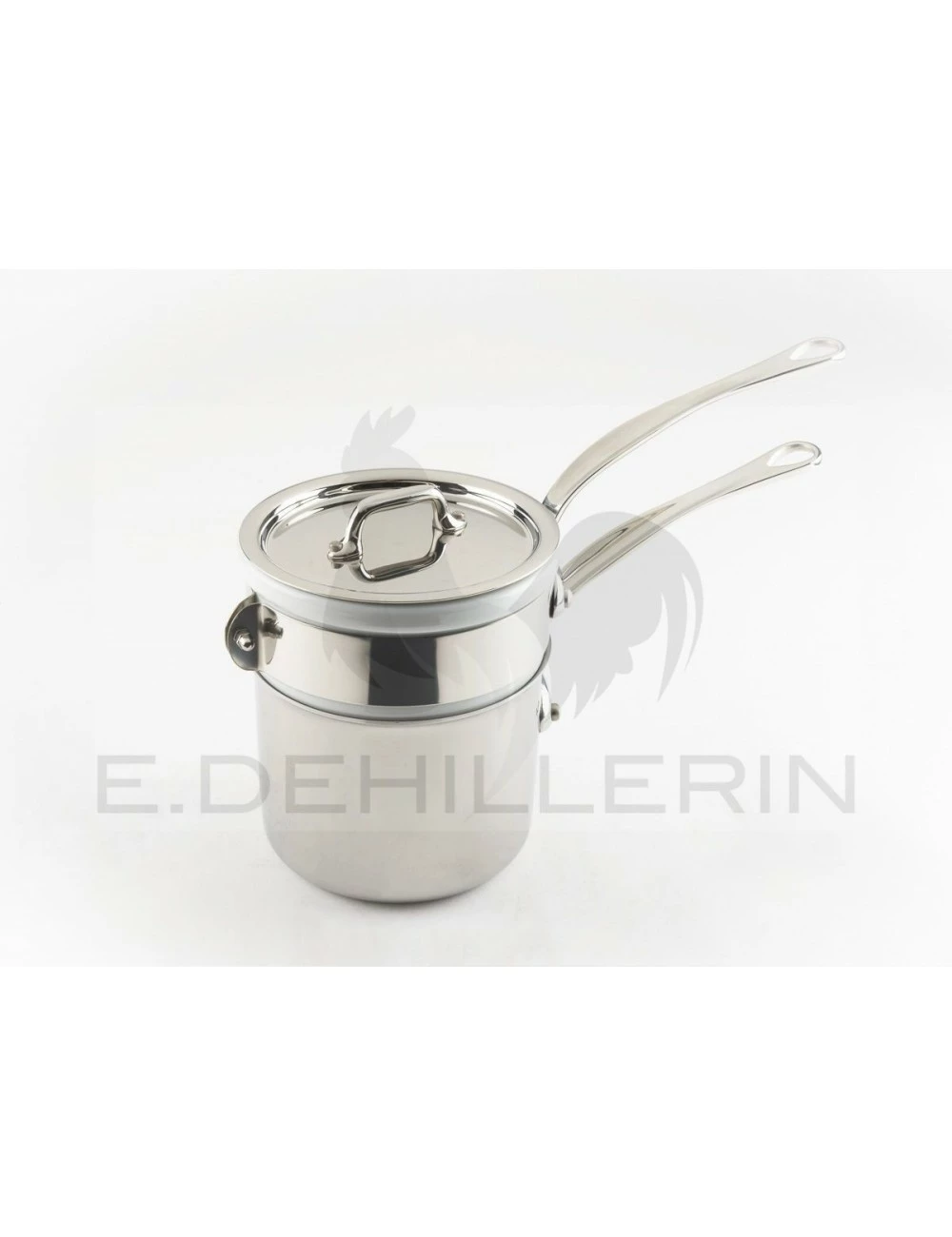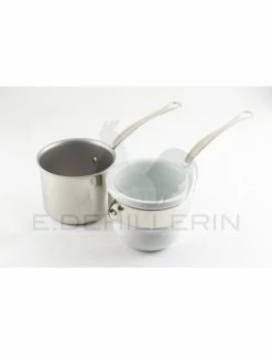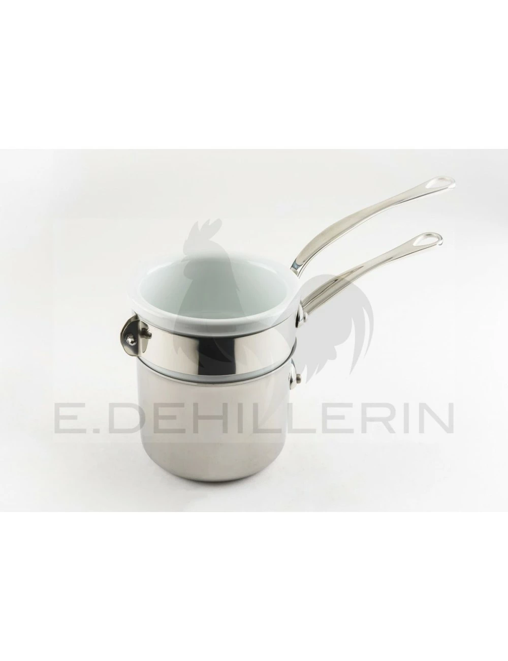Bain-marie acier inoxydable intérieur amovible porcelaine, monture acier inoxydable. L’intérieur en porcelaine contribue à une cuisson douce et homogène. Compatible tous feux dont induction. Volume 0,8 litre.