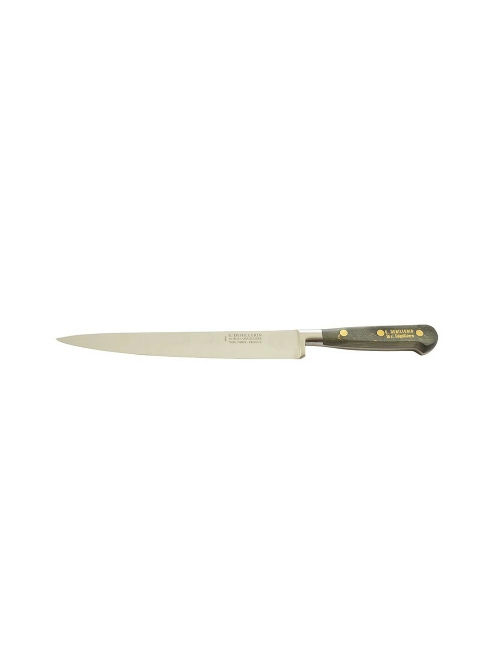 À quoi ça sert ? Comme son nom l’indique, le couteau filet de sole est l’instrument Idéal pour la découpe de tous les poissons – sole, dorade, rouget, truite, saumon… Sa lame longue (de 17 à 20 cm), fine et très flexible permet en effet de lever des filets sans abîmer la chair ou de couper le poisson en très fines lamelles. Il peut également servir à la découpe de légumes en brunoise, de feuilles de légume en chiffonnade, ou à ciseler oignons et échalotes. Couteau à lame acier inoxydable, manche en bois noir. Le plus polyvalent avec sa lame acier inox.