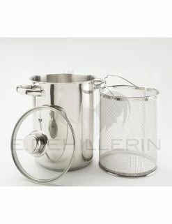 Marmite en acier inoxydable, monture acier inoxydable, panier acier inoxydable, couvercle verre. Cette marmite haute et étroite dotée d’un panier grillagé est spécialement conçue pour la cuisson des asperges. Le couvercle en verre permet de surveiller l’ébullition et la cuisson. Diamètre 16 cm.