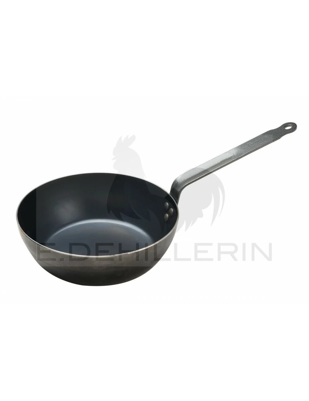À quoi ça sert ? Dans sa version classique, la poêle sert à saisir des viandes, à cuire des légumes, des champignons, des œufs (au plat ou en omelette) ou à faire sauter des aliments, notamment les pommes de terre… Avec ses bords abaissés et son long manche ou ses poignées, elle est aussi très pratique pour réchauffer et gratiner rapidement les restes. La poêle se décline en une multitude de formes dédiées à des usages bien spécifiques. On distingue en particulier la poêle à frire, à poisson – souvent rectangulaire –, la poêle à crêpes – peu profonde et à bords droits et peu élevés –, la galétière – à fond épais et sans bords… Poêle ronde dite « paysanne » en tôle noire, monture fer. Diamètre 24 cm.