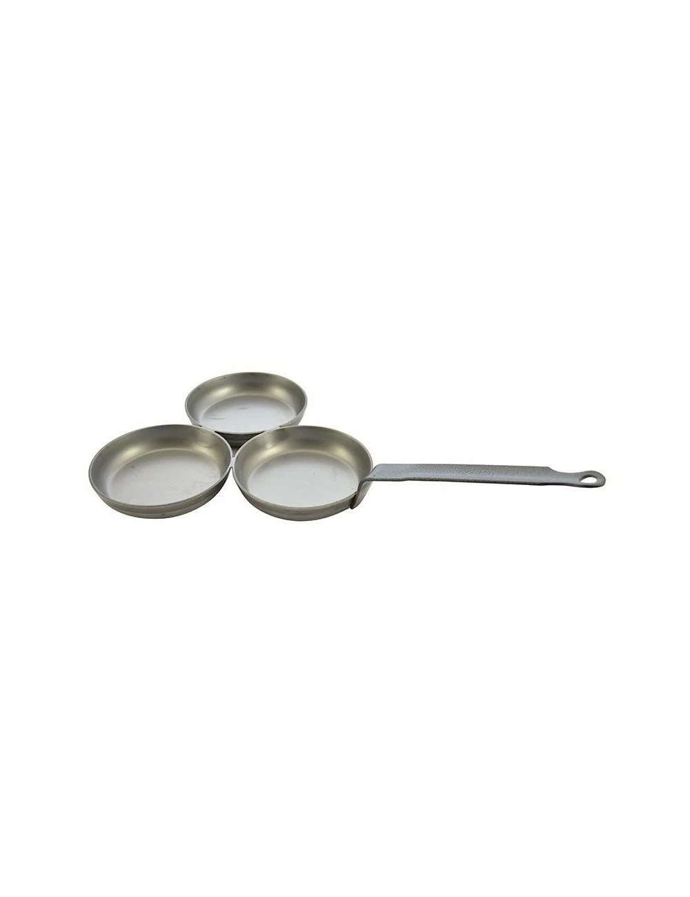 Poêle à blinis (trois emplacements) en tôle noire, monture fer. Idéale pour la cuisson de trois blinis ou de pancakes.