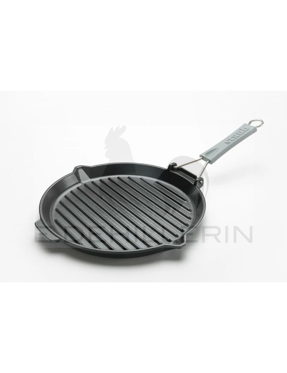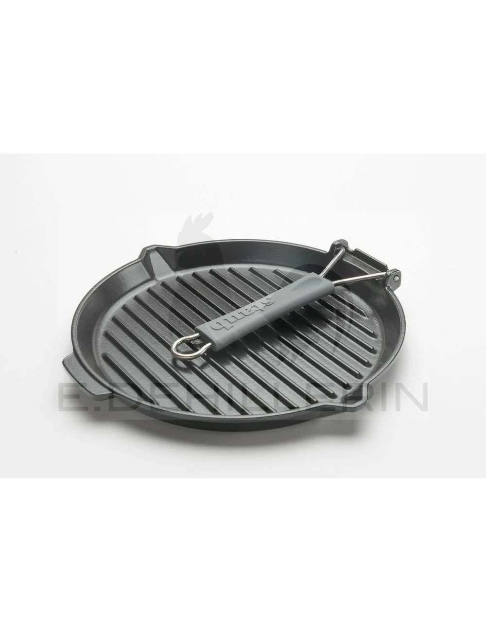 Grill rond, fonte noire émaillée, monture silicone. Utilisable comme une poêle sur n’importe quel type de feu, ce grill peut aussi aller au four. La fonte s’accomode en effet des températures les plus élevées. Idéal pour la cuisson des steaks entiers ou hachés, des escalopes, du poisson… Compatible tous feux dont induction. Diamètre : 27 cm.