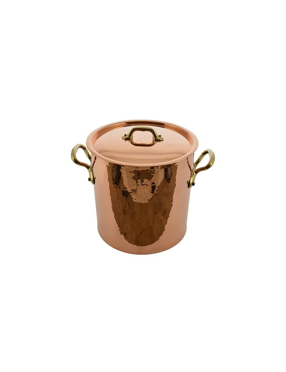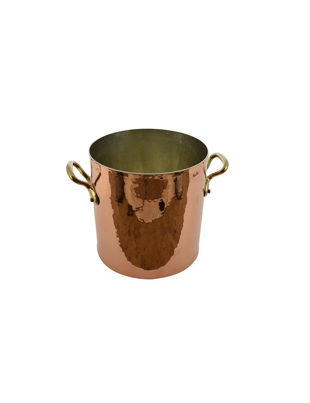 Marmite cuivre étamé, monture bronze. Le cuivre et l’étain forment un couple très homogène et permettent une parfaite conduction de la chaleur. Attention toutefois : l’étain peut se détériorer à sec dès 230 °C. Vendue avec couvercle.