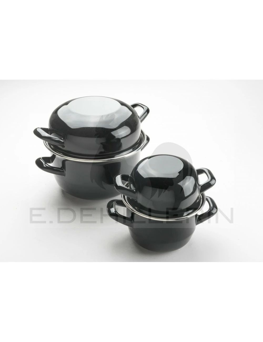 Cocotte en acier émaillée avec couvercle. Petit modèle de la traditionnelle cocotte à moules avec son couvercle utilisable pour les coquilles vides.