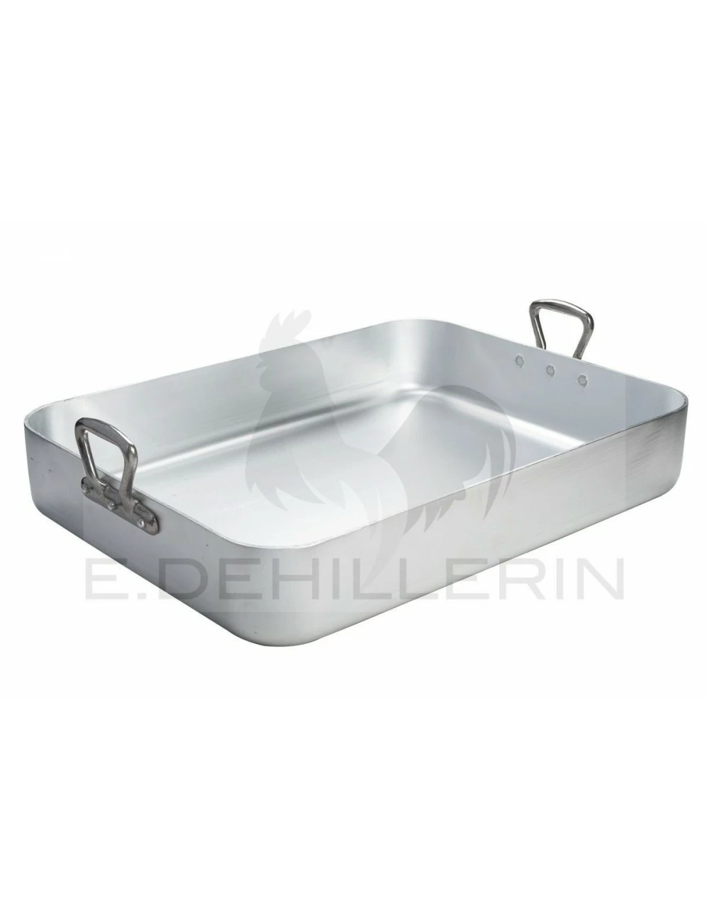À quoi ça sert ? Par essence, les plats et plaques à rôtir sont particulièrement adaptés à la cuisson des viandes et poissons au four, à découvert avec un corps gras. Ils peuvent bien sûr aussi servir à la préparation. Au-delà du rôtissage, ils sont également couramment utilisés pour la cuisson des gratins et peuvent parfois s’aventurer sur le feu d’une cuisinière. Plat (ou plaque) à rotir aluminium, monture aluminium fixe. Référence en entrée de gamme, de forme rectangulaire, très pratique pour les cuissons au four : volailles, gigots….