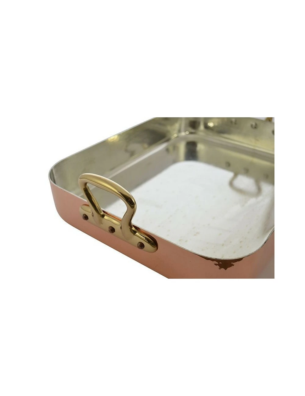 Plat à rotir en cuivre étamé, monture bronze. Le cuivre et l’étain forment un couple très homogène et permettent une parfaite conduction de la chaleur. Plat de forme rectangulaire, très pratique pour les cuissons au four : volailles, gigots… Taille maximum dans un four classique non professionnel.