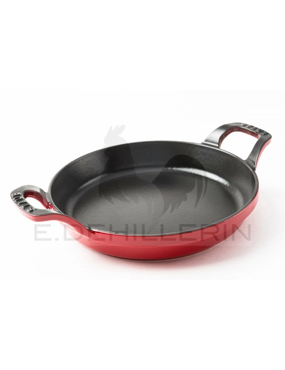 Plat rond en fonte de couleur rouge. Idéal pour passer directement du four à la table.
