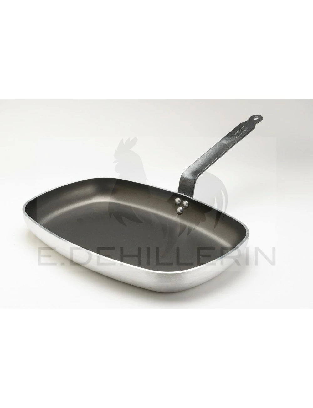 Poêle rectangulaire en aluminium revêtement antiadhésif, monture fer. revêtu époxy haute température. Le revêtement antiadhésif permet de limiter l’apport de matière grasse. Idéale pour les remises en température. Longueur 38 cm.