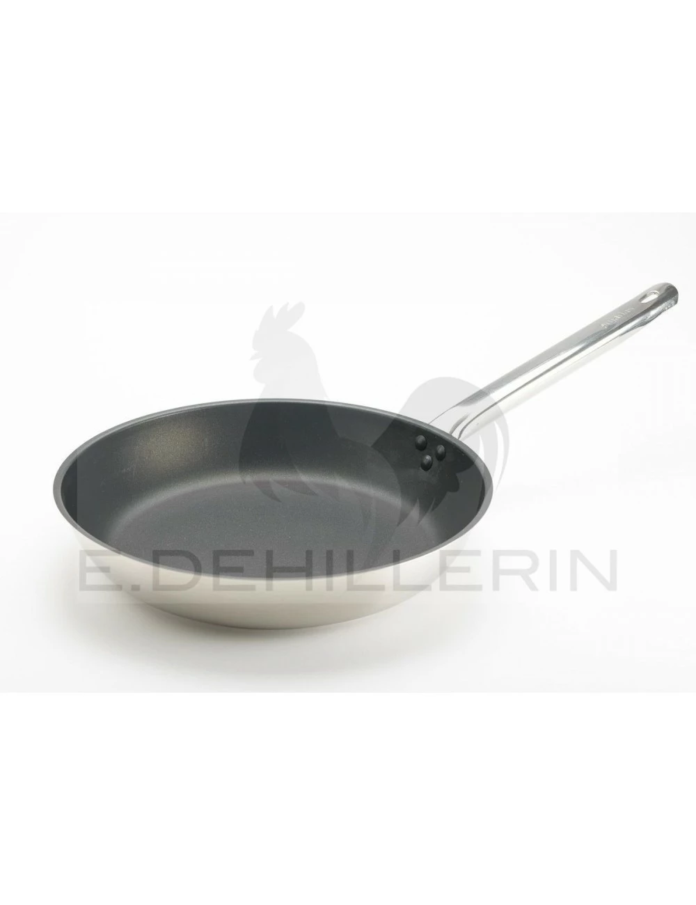 Poêle ronde en acier inoxydable brossé, monture inox, série Excalibur. Ustensile de qualité professionnelle, à la ligne épurée. Compatible tous feux dont induction.